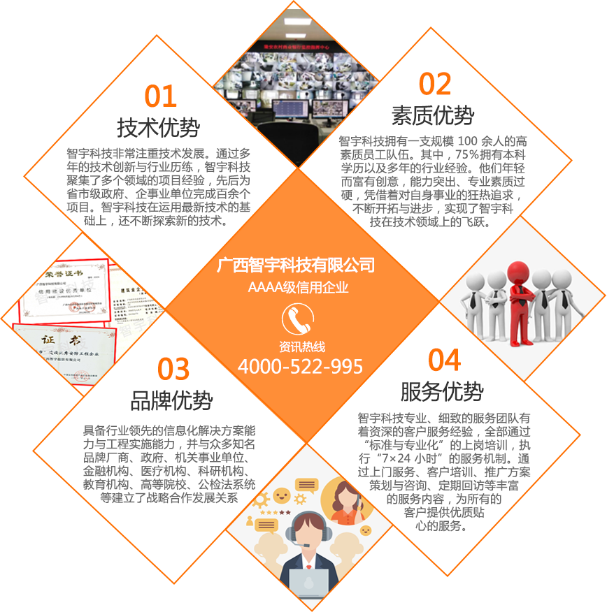 廣西智宇科技有限公司,自1995年成立以來,已發(fā)展成為一家高新技術(shù)企業(yè),擁有多家分公司,遍布南寧、桂林、玉林、河池、扶綏、百色、欽州、防城港等地。憑借30年的專業(yè)經(jīng)驗(yàn)和技術(shù)儲備,智宇科技已成為一家行業(yè)領(lǐng)先的集團(tuán)企業(yè),致力于運(yùn)用前沿科技產(chǎn)品和技術(shù),為客戶提供高效服務(wù)。